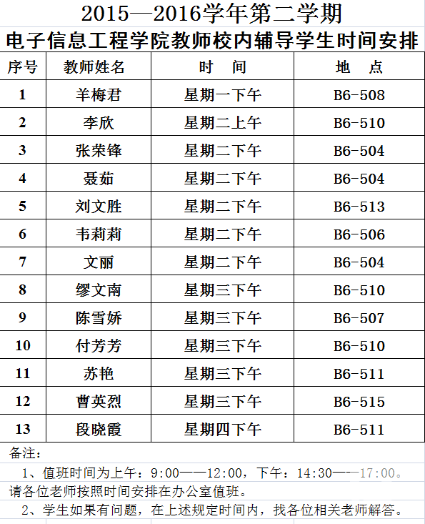 2015-2016学年第二学期电信学院教师校内辅导学生时间安排
