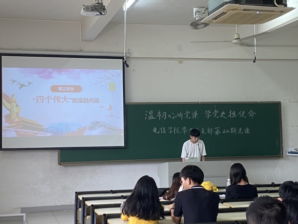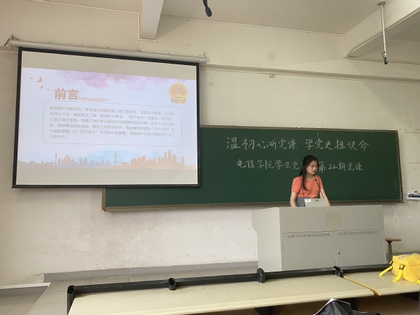 本网讯(记者 张玉蓉)伟德国际betvlctor1946学生联合党支部于2021年5月20日,在A1-205举行了第二十二次微党课学习。本次微党课的主题是《“四个伟大”领航中国发展》,主讲人是郑慈丹、刘文铤同志,学生党员同志和入党积极分子都认真听取了此次党课。