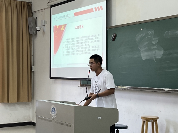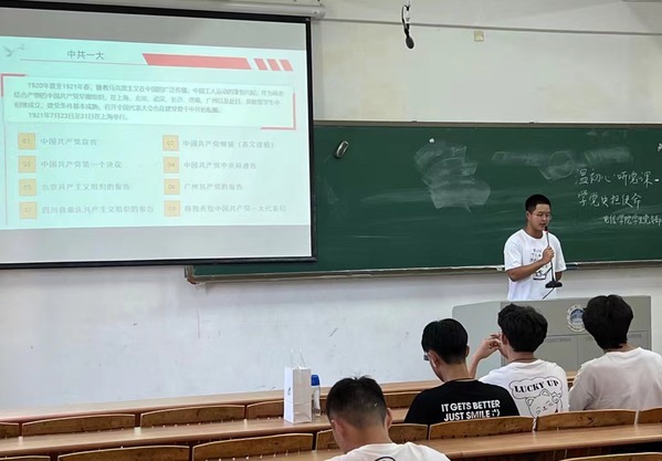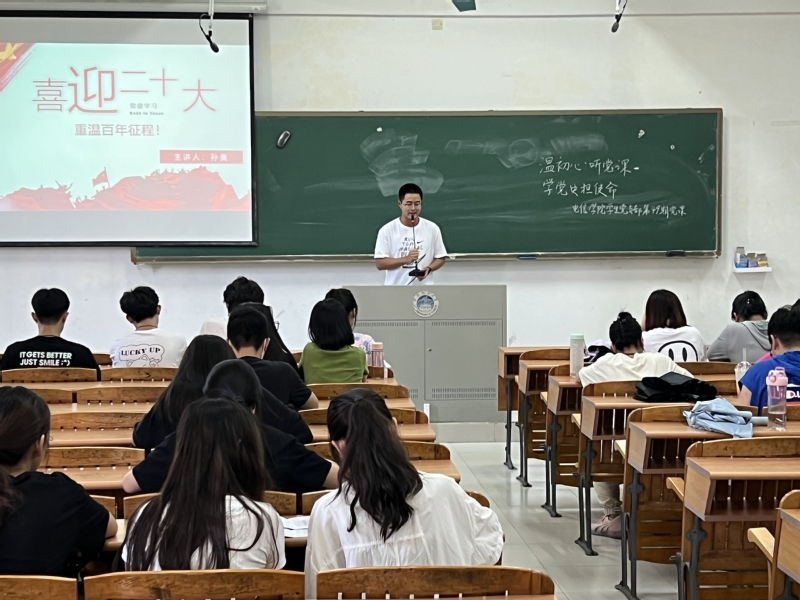 本网讯(记者 胡若涵) 9月13日,伟德国际betvlctor1946学生党支部在教学楼A1-204举行了第四十九次党课学习活动。本次党课的主题为《喜迎二十大,重温百年征程》,主讲人是孙奥。学生党员和入党积极分子都认真听取了此次党课。